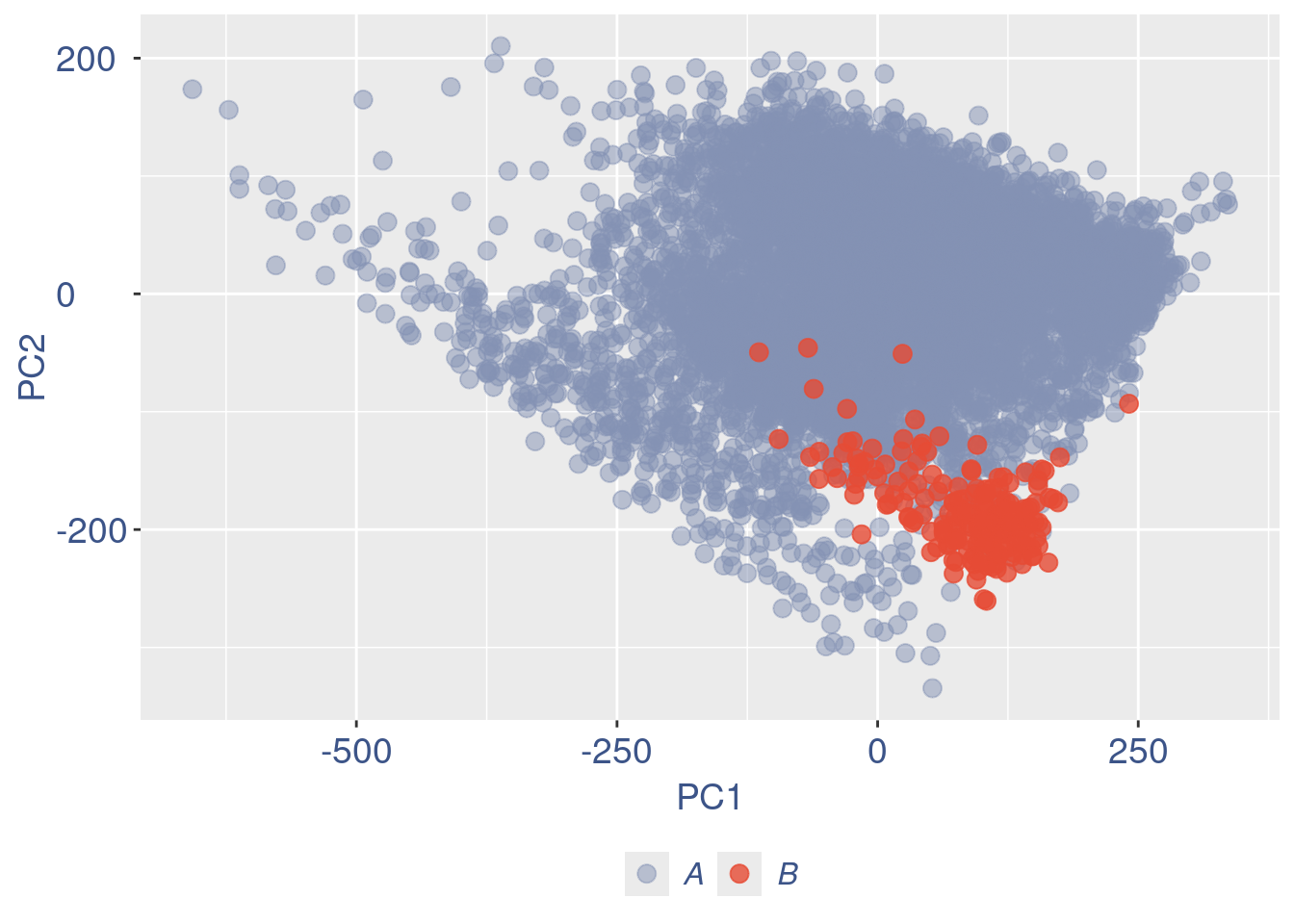 cells_to_rem <- rownames(pcaCellsData)[pcaCellsData[["groups"]] == "B"]