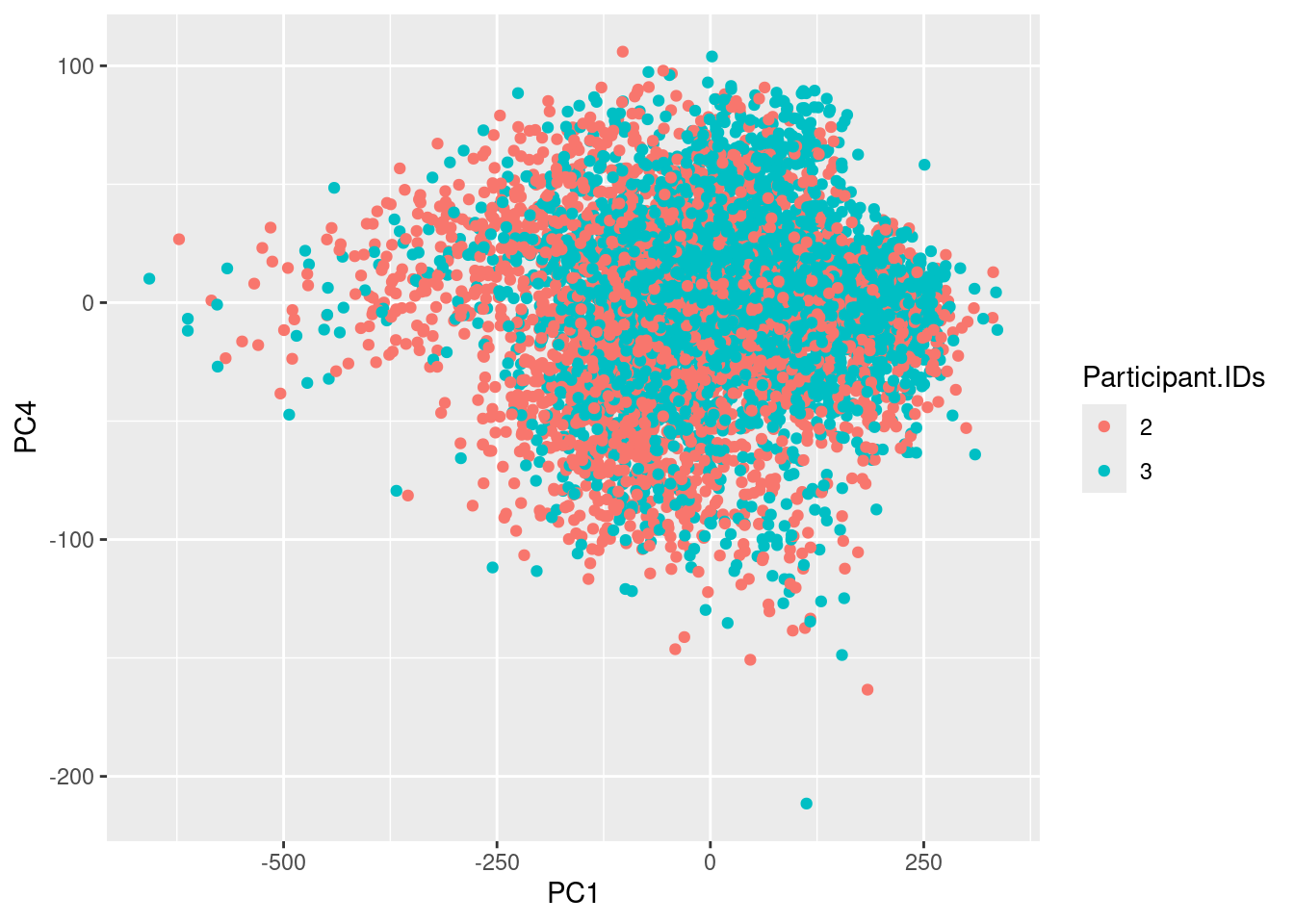 ggplot(df,aes(x=PC1,y=PC4,color = Participant.IDs)) +geom_point()