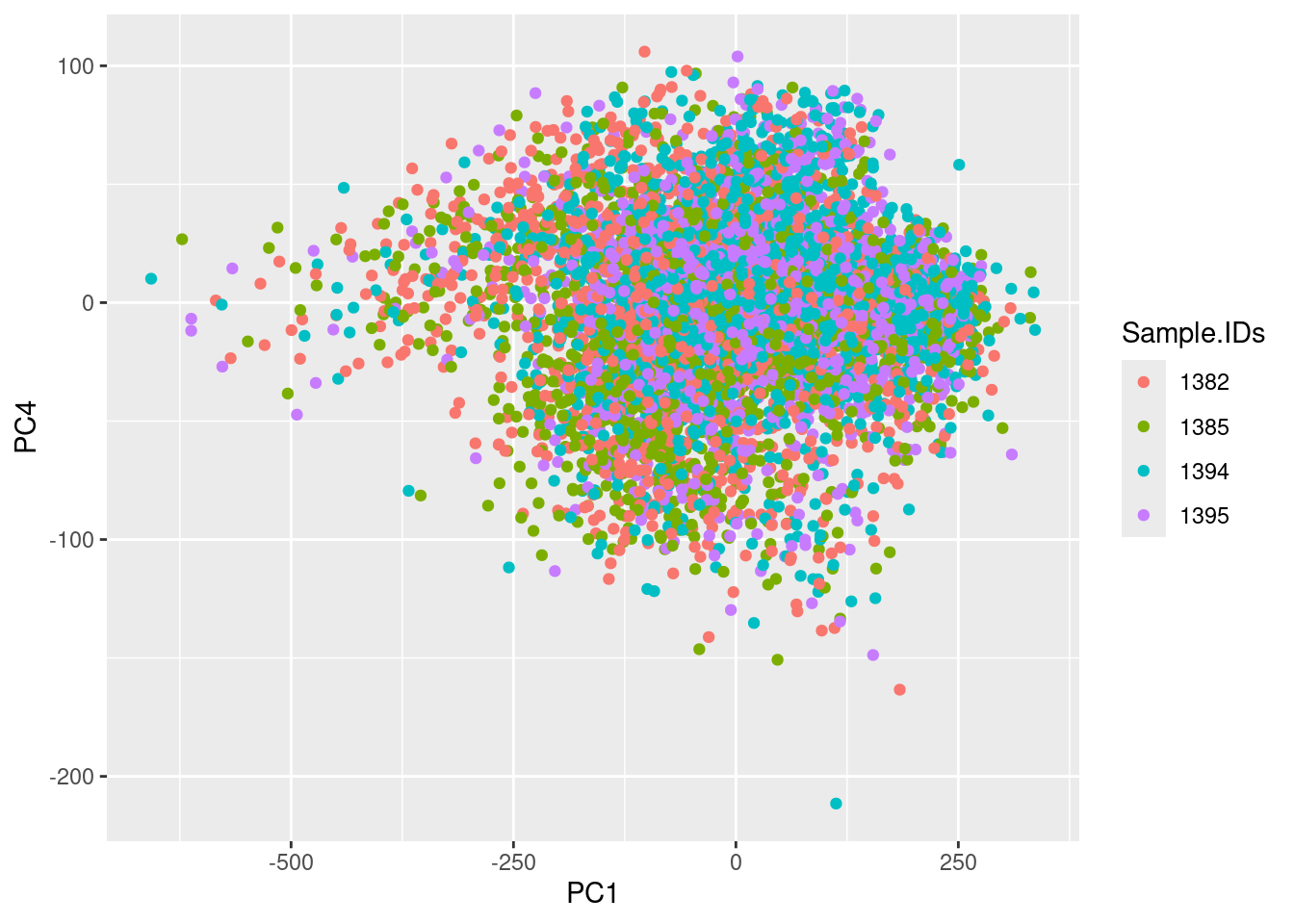 ggplot(df,aes(x=PC1,y=PC4,color = Sample.IDs)) +geom_point()