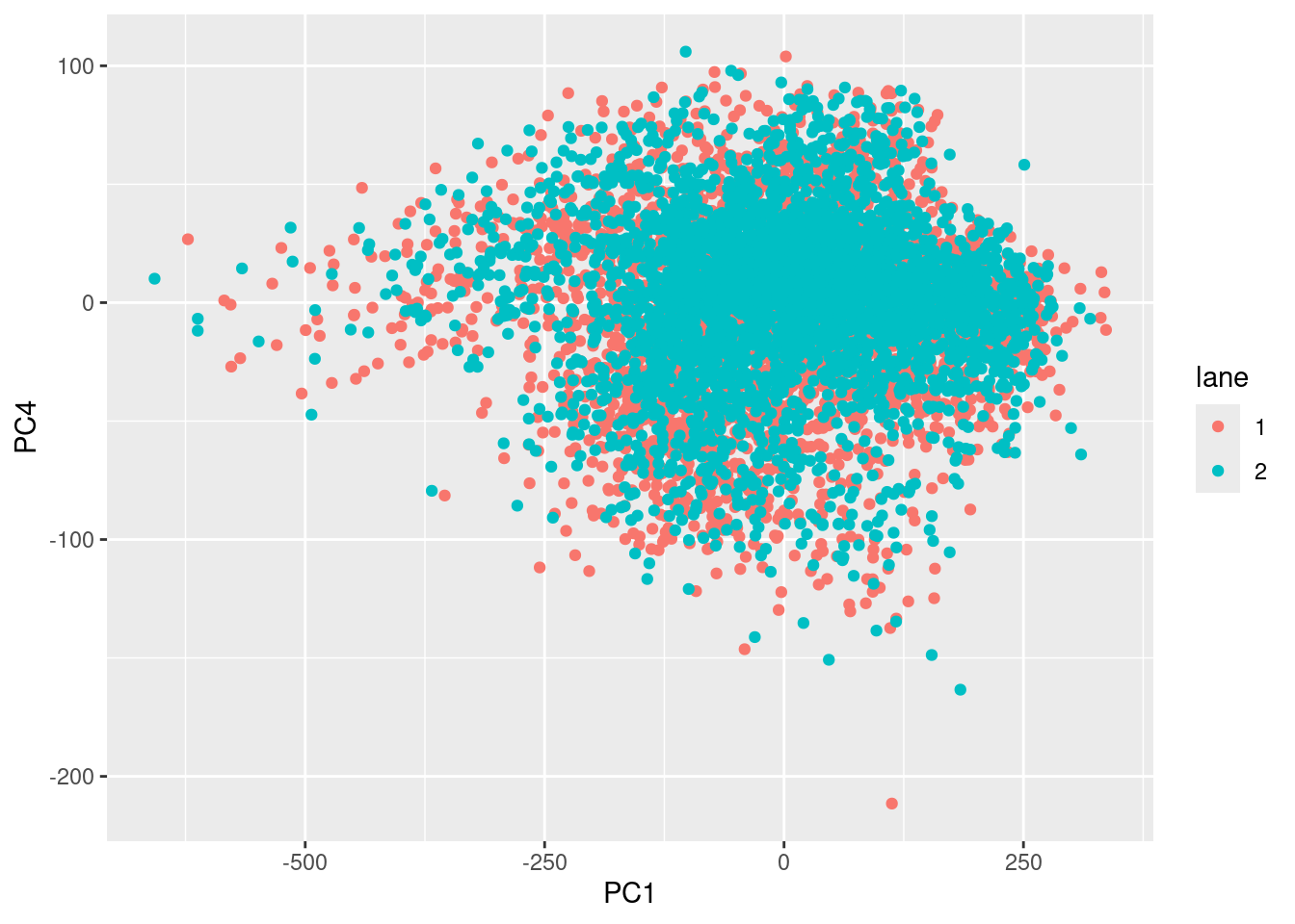 ggplot(df,aes(x=PC1,y=PC4,color = lane)) +geom_point()