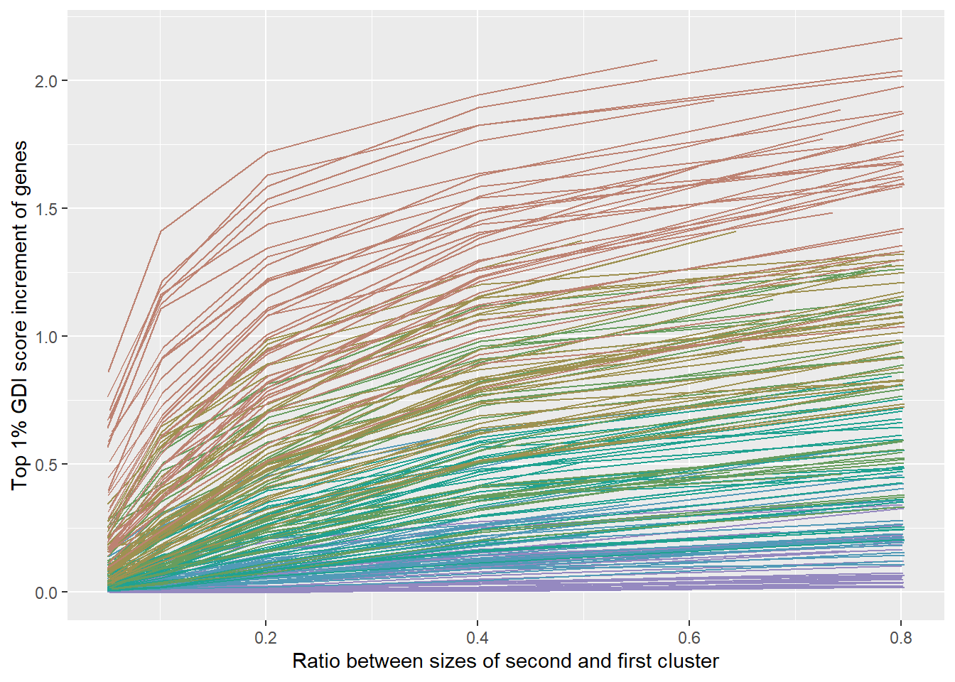 The plot shows that having the 20% extraneous cells in the mixture coming from multiple clusters does not affect significantly the sensitivity of the GDI to score cluster uniformity.