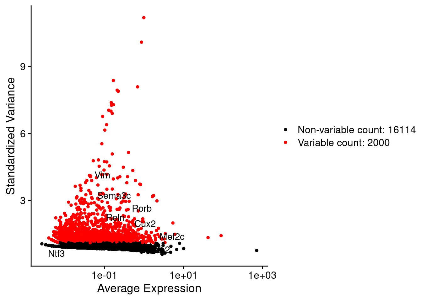 c("Reln","Lhx5","Cux1","Satb2","Tle1","Mef2c","Rorb","Sox5","Bcl11b","Fezf2","Foxp2","Ntf3","Rasgrf2","Pvrl3", "Cux2","Slc17a6", "Sema3c","Thsd7a", "Sulf2", "Kcnk2","Grik3", "Etv1", "Tle4", "Tmem200a", "Glra2", "Etv1","Htr1f", "Sulf1","Rxfp1", "Syt6")