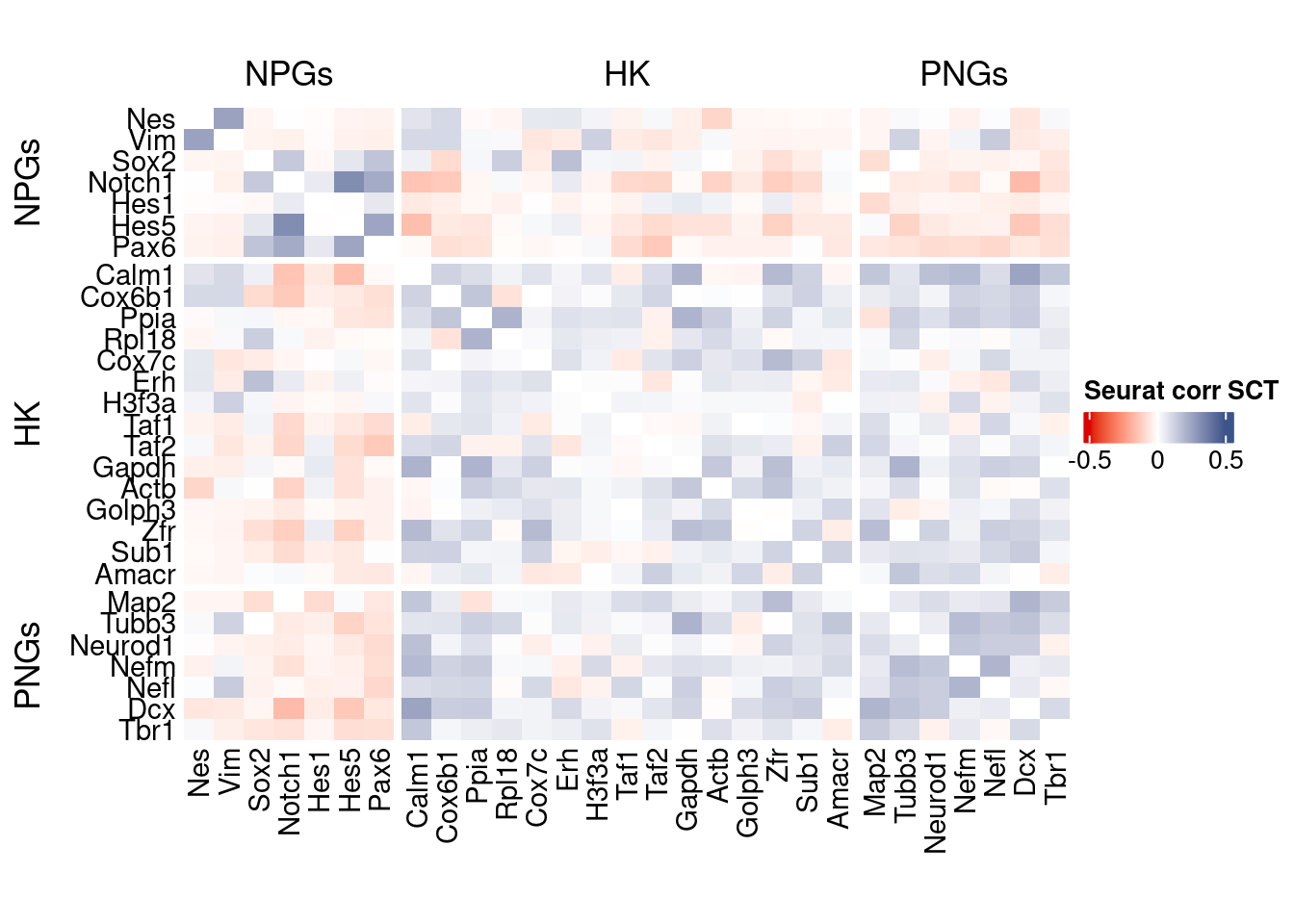 c("Nes", "Vim", "Sox2", "Sox1", "Notch1", "Hes1", "Hes5", "Pax6"),
